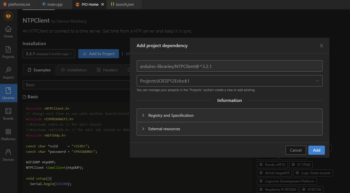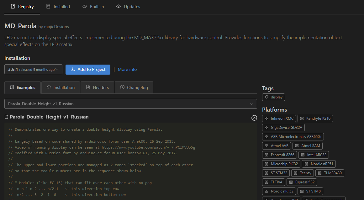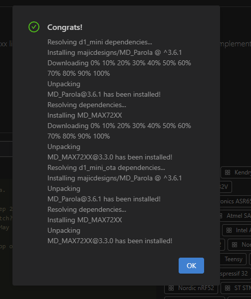 For the control of the MAX7219, I have chosen the MD_Parola library. It can be installed very easily via PlatformIO. Basically you just have to search for it and click through the installation process. Everything is automatic.