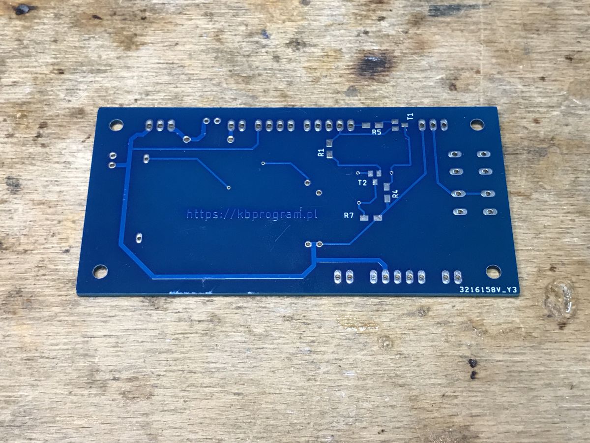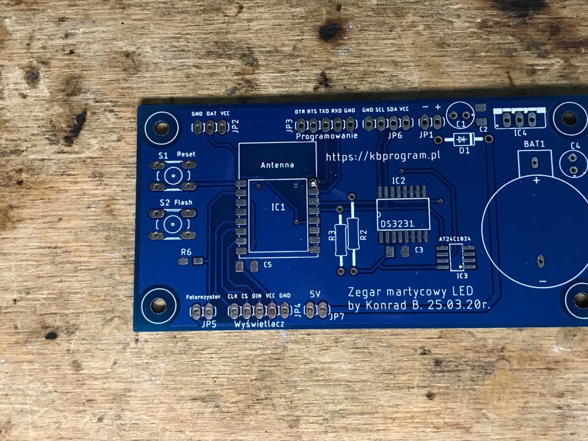 This board is a strange mix of THT and SMD. I don't know why exactly the author conceived it this way, maybe it was supposed to be a golden mean between size and soldering difficulty? You have the documentation of the project on the author's page given on the board. Basically, there is nothing to discuss here. Power block with a 3.3V LDO (I used a TC1264), ESP12, clock block with battery cage, I2C lines with pull up resistors, EEPROM also on I2C and basically that's it.