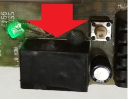 And then there is our defective hero of the episode. A small relay in a black housing. Mounted on a PCB, this is the module from the car. Pressing the momentary tact switch visible on the right switches on the relay's operating contact, which applies 12V to the module's output. Another press switches it off. I deliberately do not show the whole circuit, how it is controlled etc. as I want to show, on this particular example, the operation, behaviour of the damaged relay itself . The green LED does not have any meaning here, please do not be confused by it