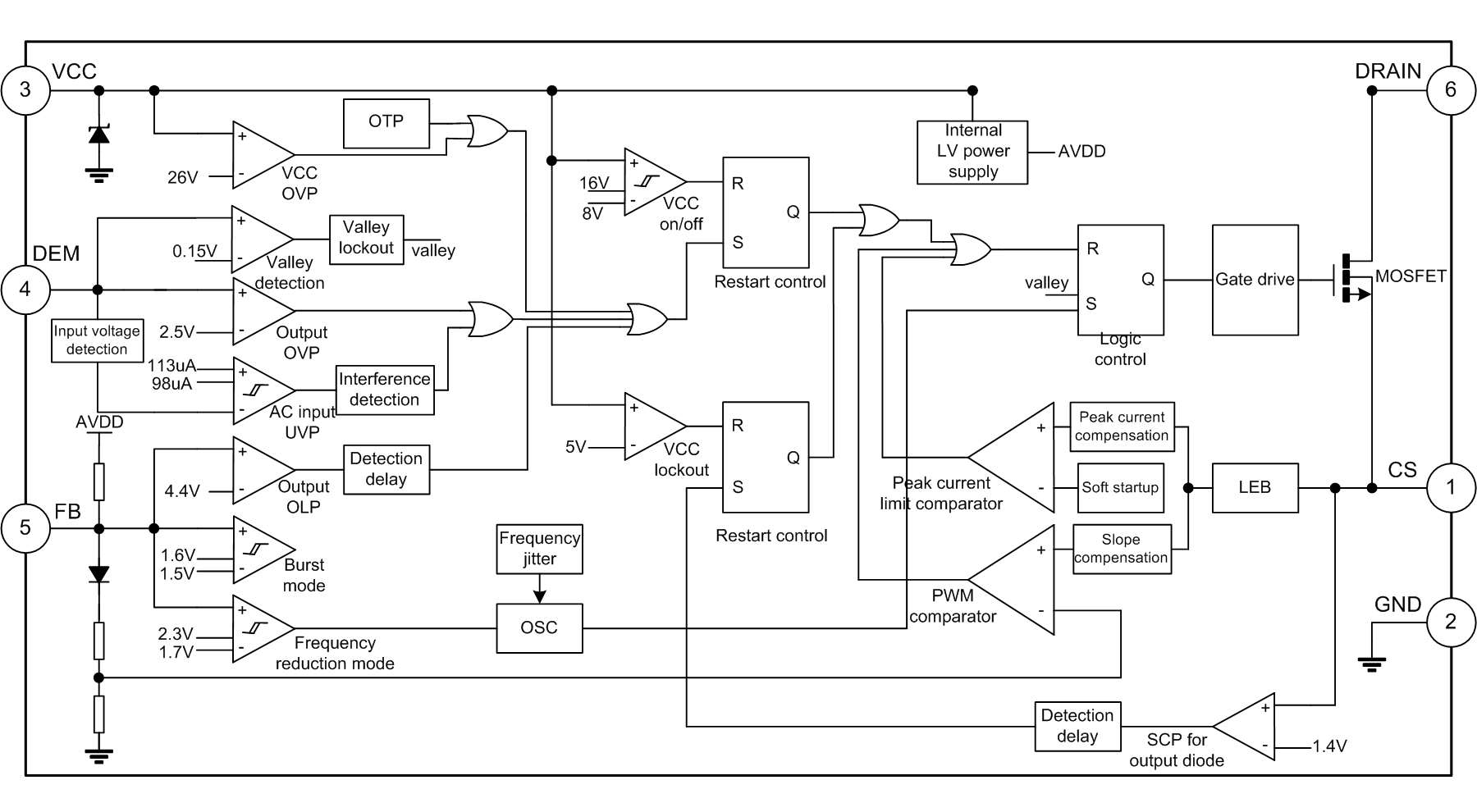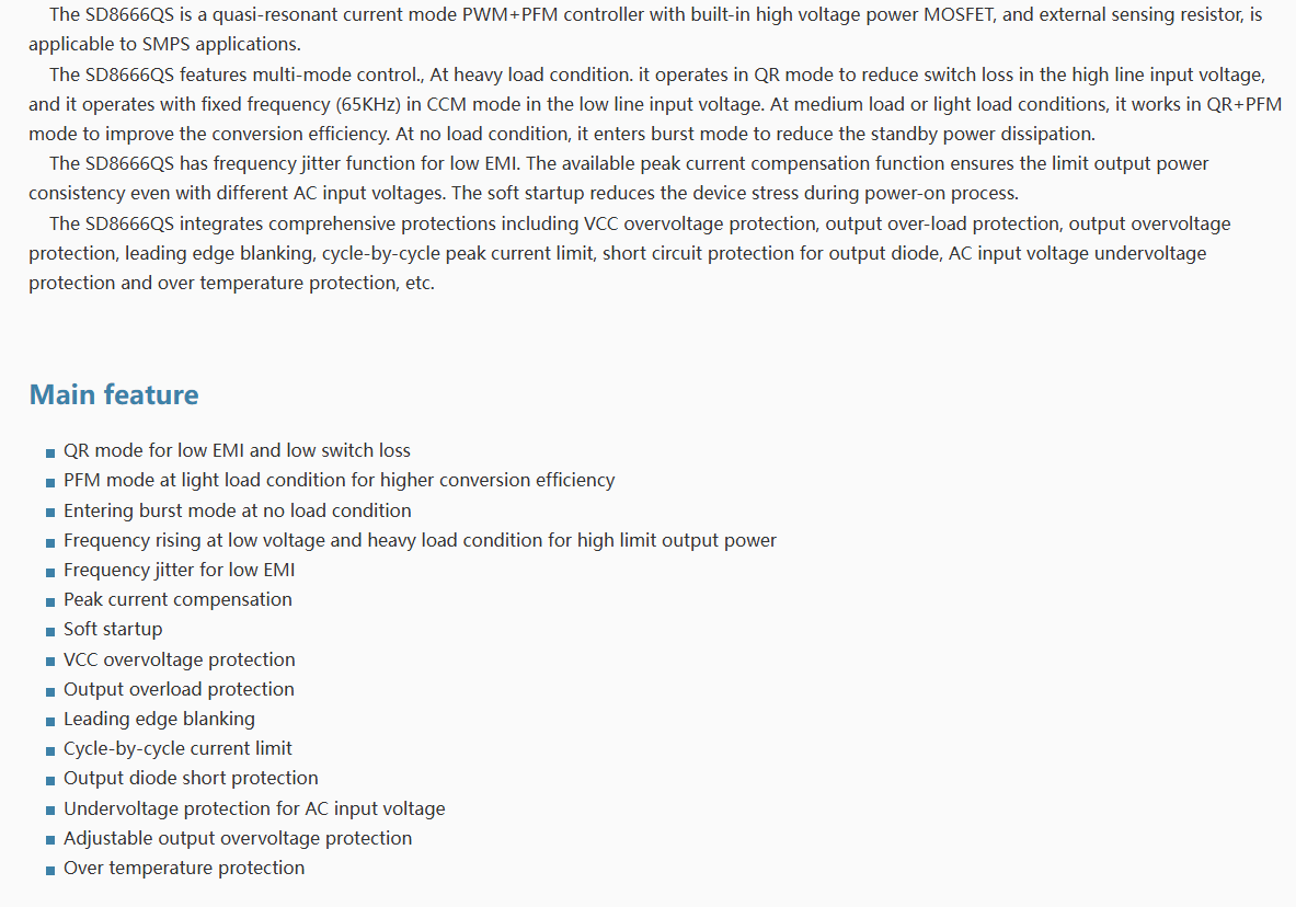 The inverter is in flyback topology and is based on an SD8666QS chip with an integrated MOSFET transistor.