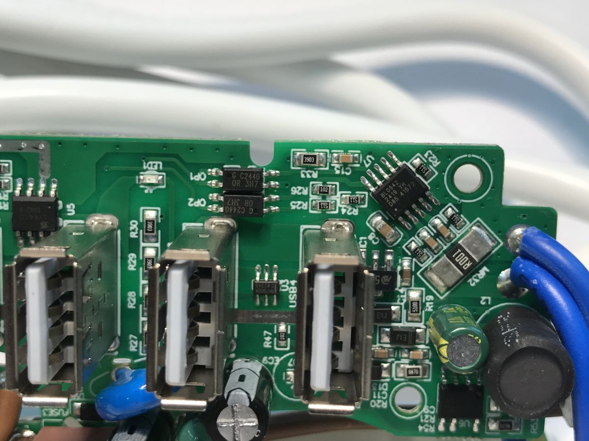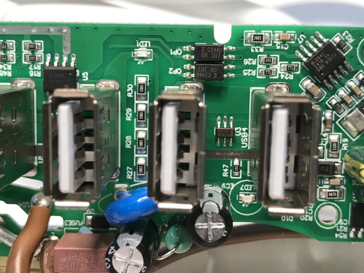 However, the rest of the design of the strip seems to be quite good. There are filters against interference emissions in the power supply circuitry, the USB ports have dedicated circuitry to report themselves as a suitable power supply for phones, and the transformer itself also looks quite good.