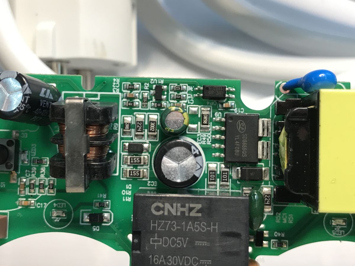 The whole thing doesn't look so bad. There are even filters against EMI emissions on the input. In addition, I can even see a varistor (surge protection) and, of course, relays - one per socket, CNHZ HZ73-1A5S-H at 5V.