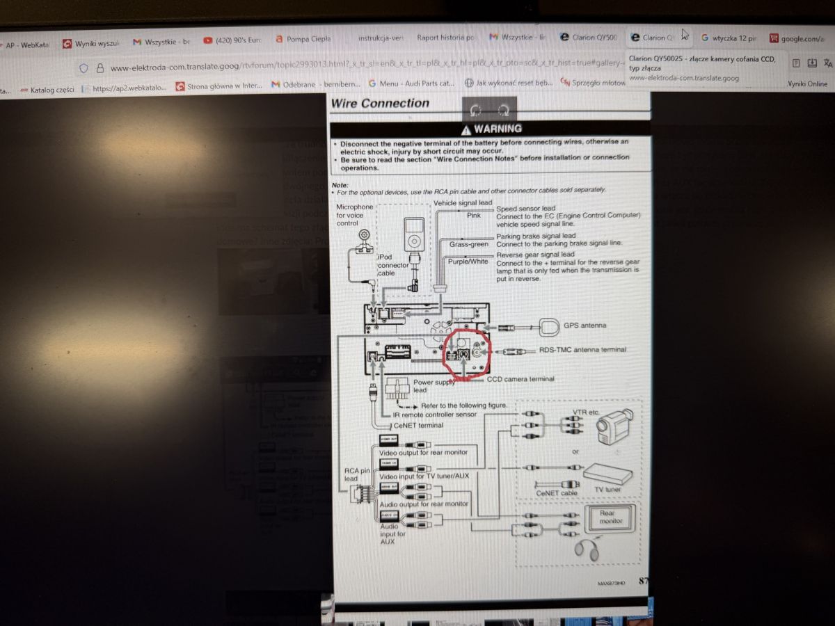 At the electronics store I was told that it would be difficult to get such a plug. There is no such cable in the official Clarion offer. In addition, it can be suspected that a direct connection of a CCD camera (taking into account all combinations) will not give an image anyway, because some "terminal" may be needed. In this situation, I decided to connect the camera to another input - RCA pin (photo 1 on the left). The problem is that I didn't have the right plug, so using the double pin and the diagram (photos 2 and 3) I connected the camera to the pins responsible for AUX (video in).