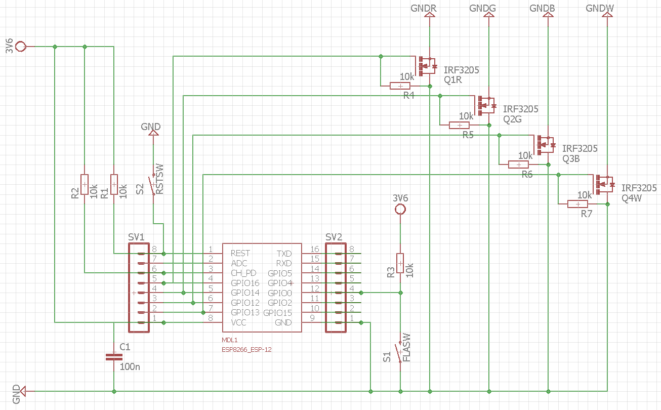 The circuit is based on an ESP8266 chip to act as a driver for an RGBW LED strip over the internet. This is my first circuit drawn in Eagle and the first circuit I want to "iron out" a PCB from.
