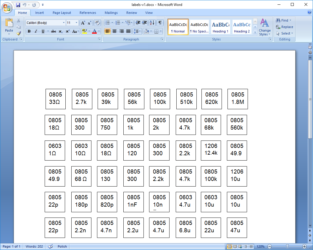 In order to sign the containers, I prepared myself a simple template in Word. There are squares of 15mm sides (when printed on A4 paper) into which you can write the abbreviated names of the items: