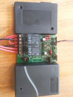 The receiver is based on a PIC16F628 microcontroller and works with two remote controls on HCS301 (Keeloq).