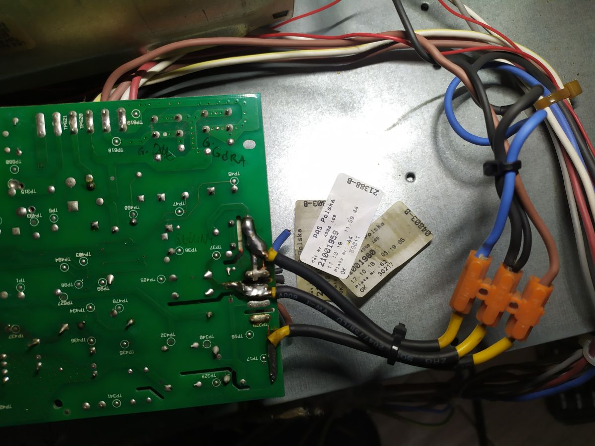 Everything was soldered, the connectors were checked, it took many hours, finally: Two relays were replaced (white and red - marked) and the melted socket-pin was replaced with a decent ceramic connection cube (yellow cables) - works in a warm environment, there are small children at home - so, of course, you need to make sure there is no puncture to the housing in case the plastic melts
