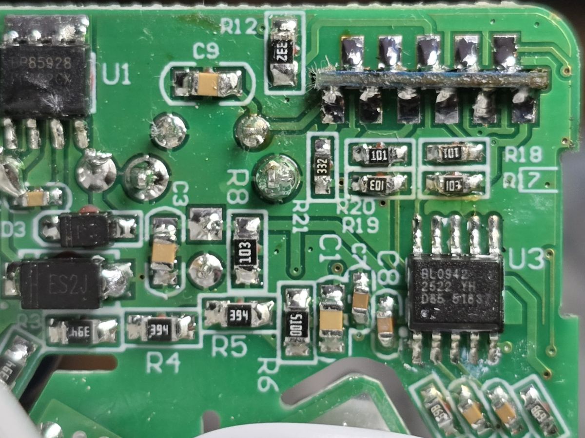 Another notable change is the live/neutral AC prongs are captively moulded into the rear panel, making it is necessary to use a relatively high powered iron to de-solder them so the board can be freed. I guess this new design increases reliability by utilising the case as a strain relief for the prongs. That way, the solder joints don't experience stress each time the PC191HA is plugged/unplugged from the wall. By contrast, the Series 1/2/3 PCB could be pulled out of the plastic case without desoldering the prongs.