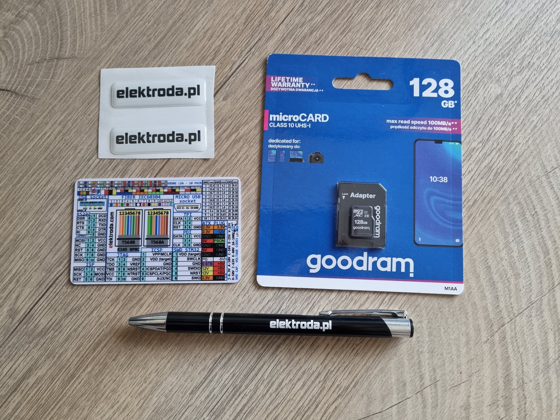 Every confirmed author receives a 128 GB MicroSD card, a metal pen with stylus, and a pocket-sized laminated electronics reference card; some envelopes also contain stickers or USB gadgets [Elektroda, rchristescu, #21083219; Elektroda, ststefanov, #20513686].
