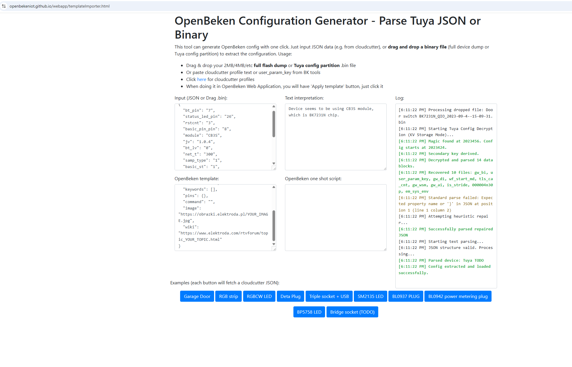 You can get a template manually, either from tuya-cloudcutter/device binary, or from OpenBeken templates. OpenBeken templates are better, because they are user-created and usually more complete, but a template from tuya json can be a good quickstart for basic devices. As you can see, there are many ways to get OBK running, but remember, no matter which approach you choose, you can always ask for help on our forum. Have fun!
