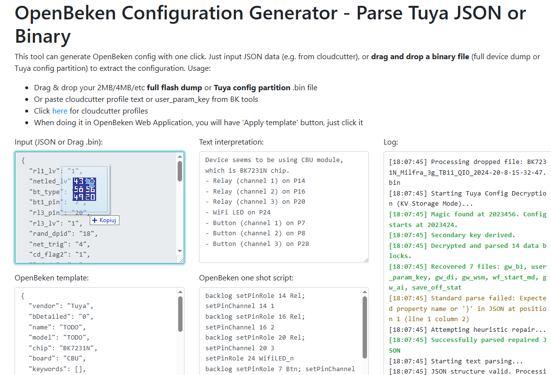 Every OpenBeken/Tasmota/etc device requires a brief configuration after the initial flashing of the firmware. This configuration requires setting a proper roles for GPIOs, which are different for each device. Here I will show you an automatic way to configure GPIOs in OpenBeken. In OpenBeken, you can import GPIO directly from Tuya settings. This method is quick and efficient and works for most of the devices, only the TuyaMCU ones might require fully manual work.