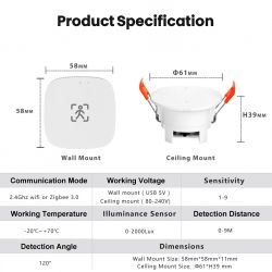 Here is the product specification. Power is from 5V, the product offers motion detection in the range of distance set by the user, as well as performs lighting measurement:
