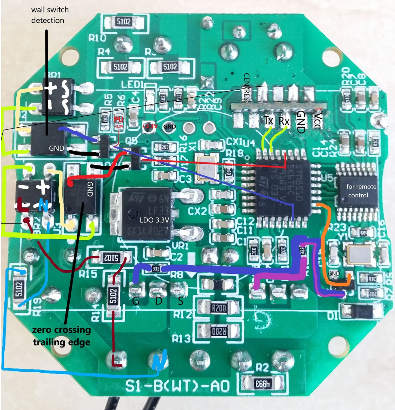 The dimmer uses a Tuya WB2S Wi-Fi module based on the BK7231S SoC and communicates with a TuyaMCU daughterboard over UART at 115 200 bps [Elektroda, andyc1, #20652186; p.kaczmarek2, #20652300].