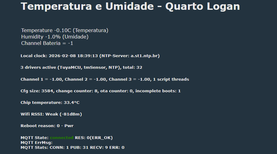 publish DATA {"ROOM":"1","TEMPERATURE":$CH1,"HUMIDITY":$CH2}Info:TuyaMCU:Consumed 20 unwanted non-header byte in Tuya MCU buffer