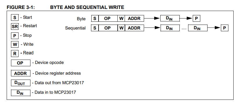 Therefore, the control byte you would need to send first for writing data to the MCP23017/MCP23S17 chip with A2, A1, and A0 high would be: