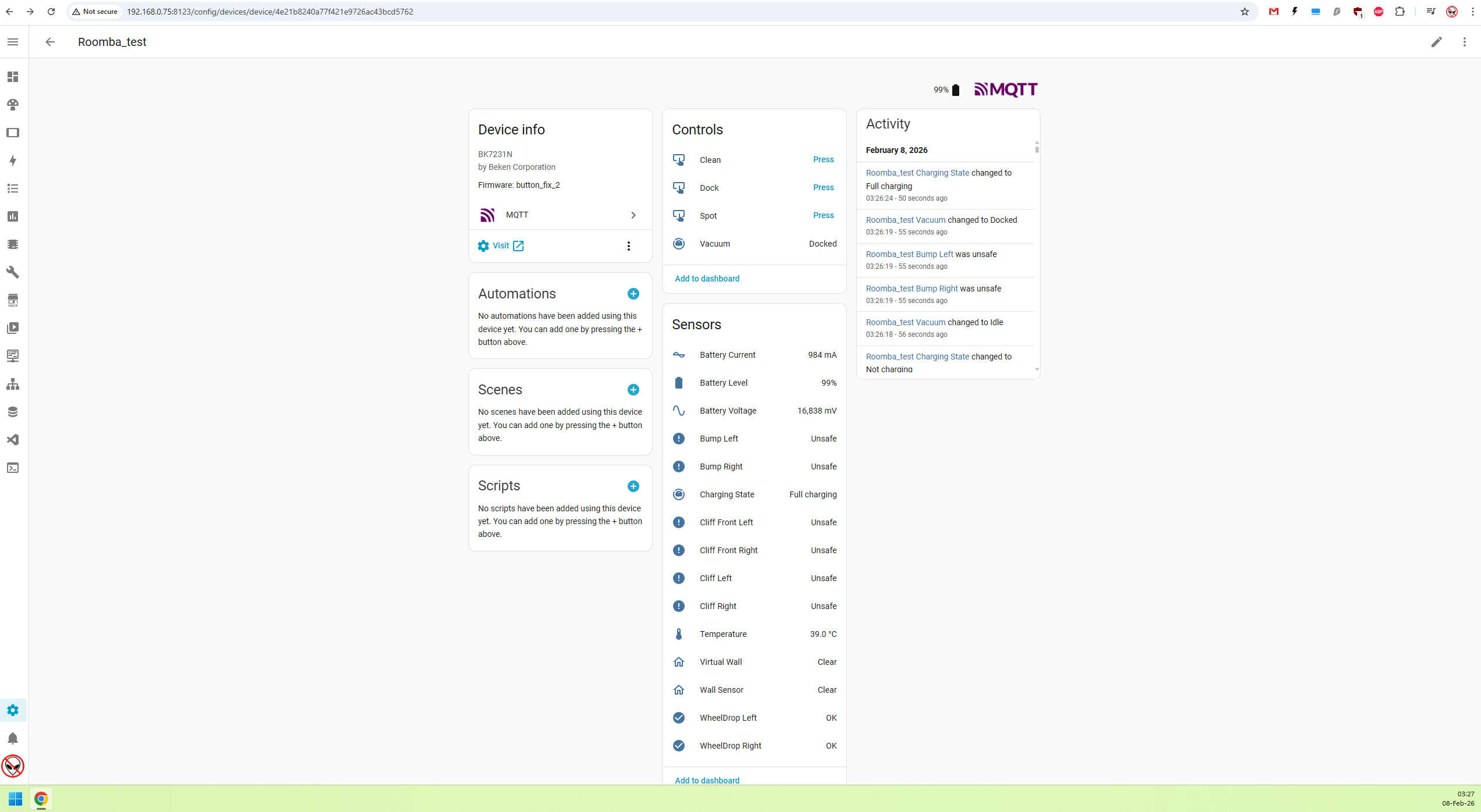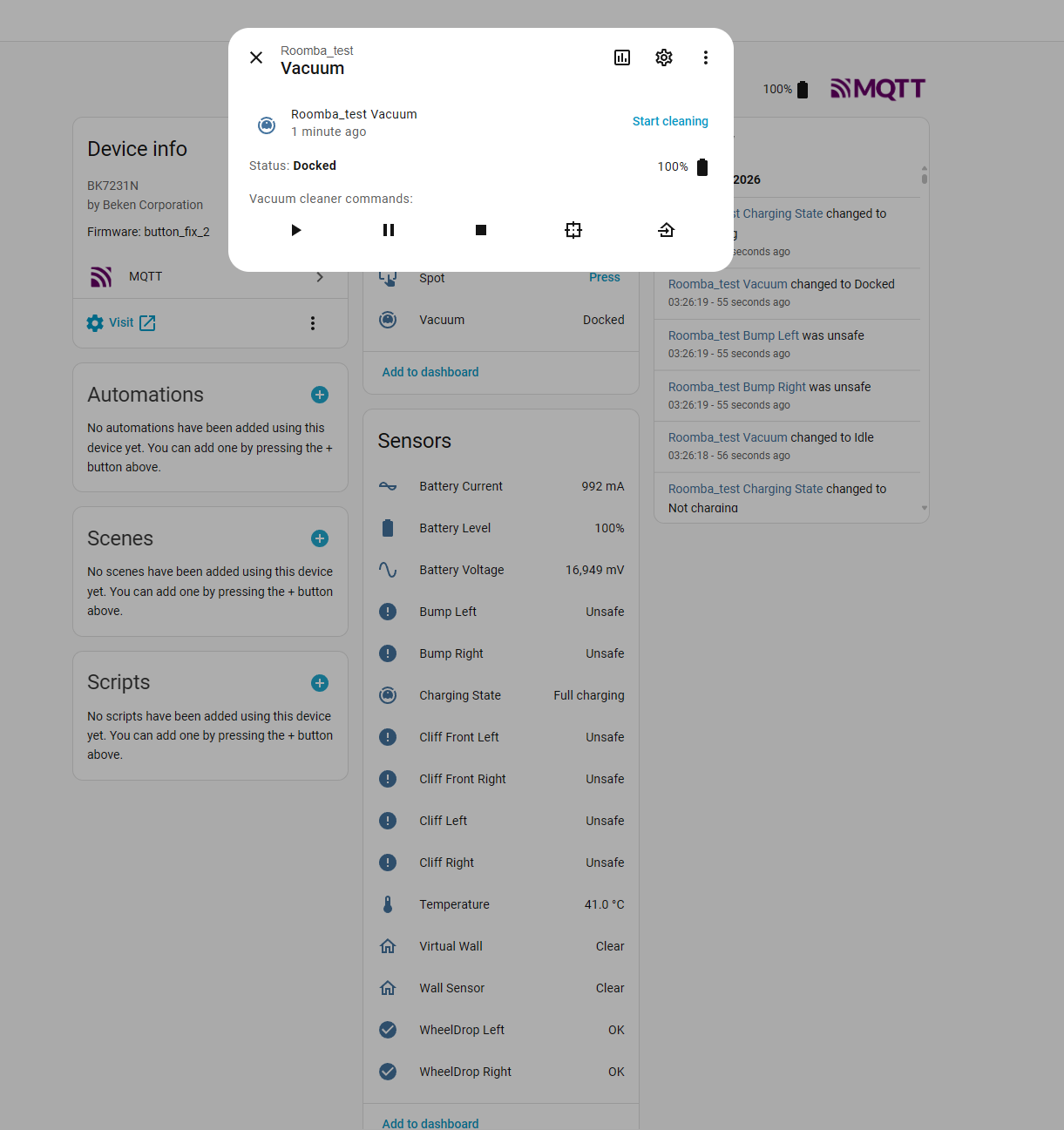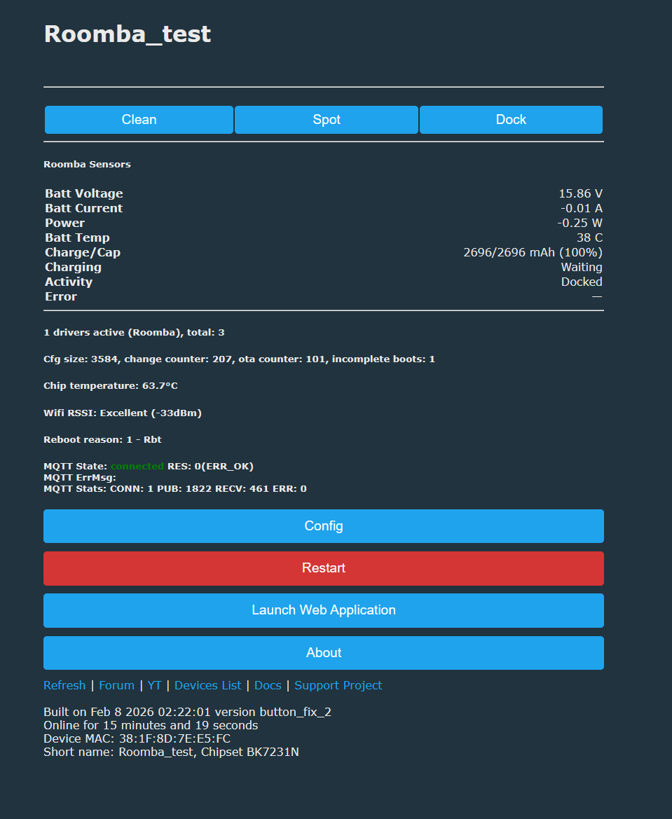 Of course I probably also don't need to mention that such a control can also be realised without problems on the ESP, in combination with OTA it can also be a nice toy. We simply used what we have at hand. Now the hoover works from the HA, although it will definitely be useful to get the aforementioned battery parameter reading. All in good time.