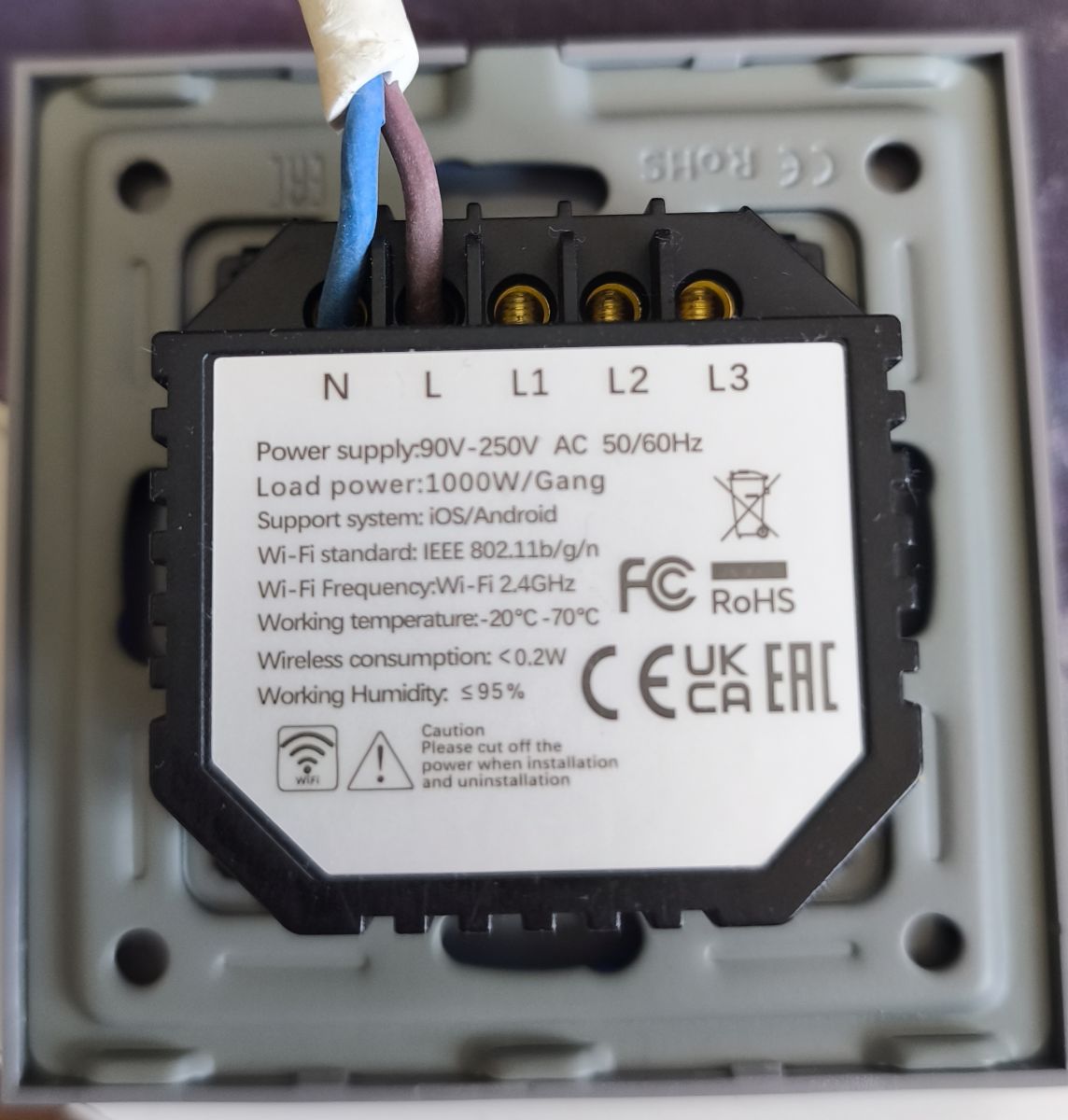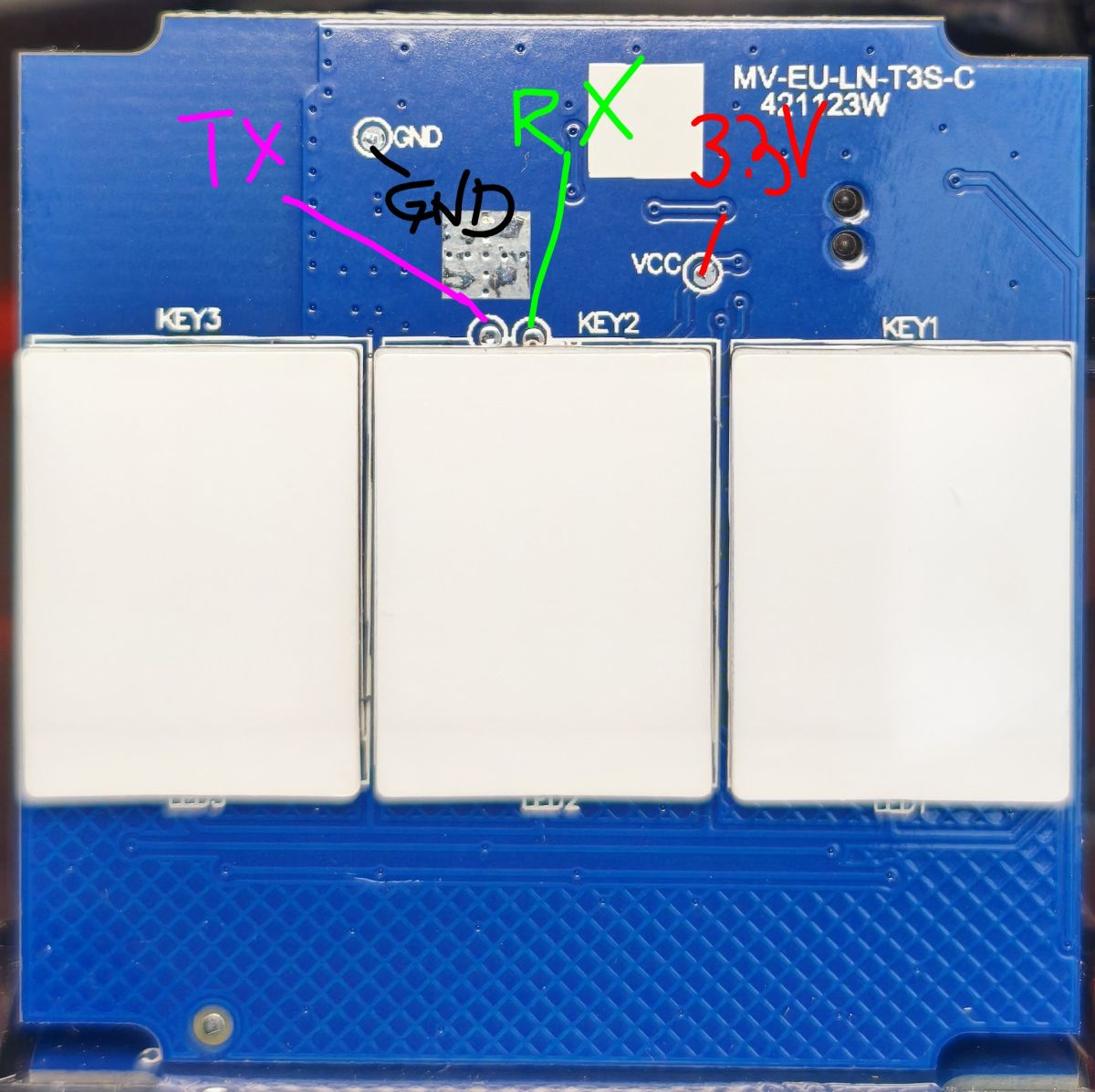 The image shows a 3G switch, but the pins are the same (1G, 2G, 3G, Curtain), above 1G you have to lift the button, it is glued, to access the Rx and Tx Pins (P10 P11).