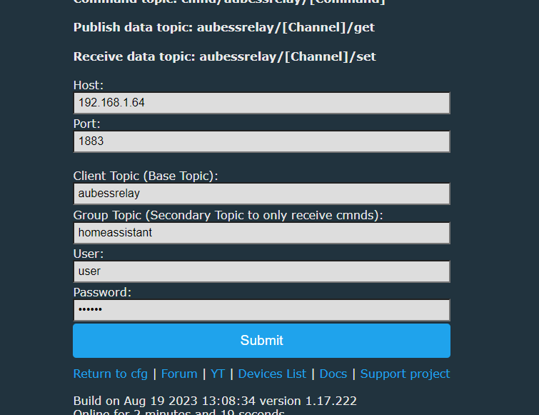 Hi, I have just sflashed the aubess relay on openebeken, I have set pin 26 as relay and via the website I can control it. But I want to connect it to homeassistant via MQTT, and I have a problem because I have MQTT connected (data is 1000000% good) and it even says mqtt connected but no new device appears. What can I do in this case?