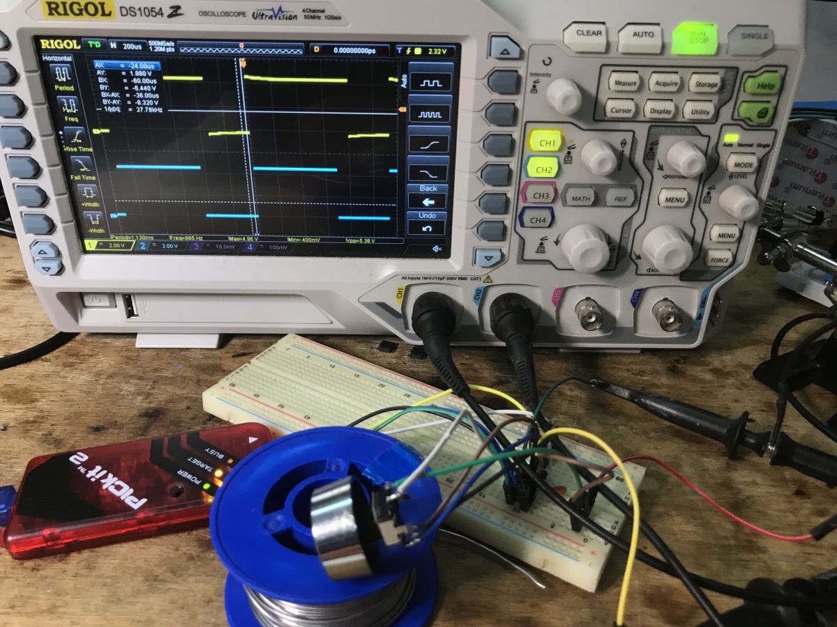 I connected an oscilloscope to the GPIO to check that the program works: