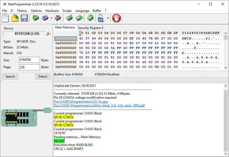 Screenshot of NeoProgrammer showing XT25F32B flash memory and hexadecimal data