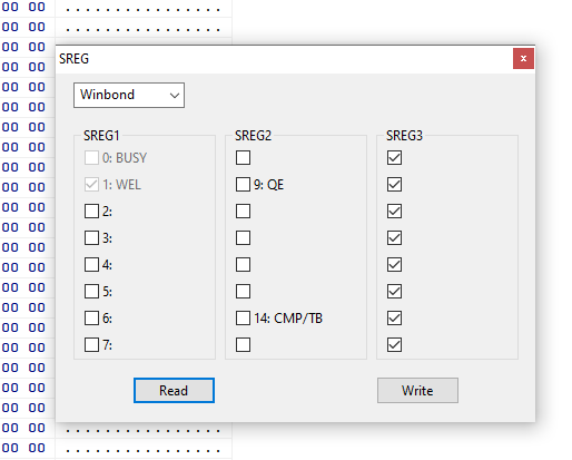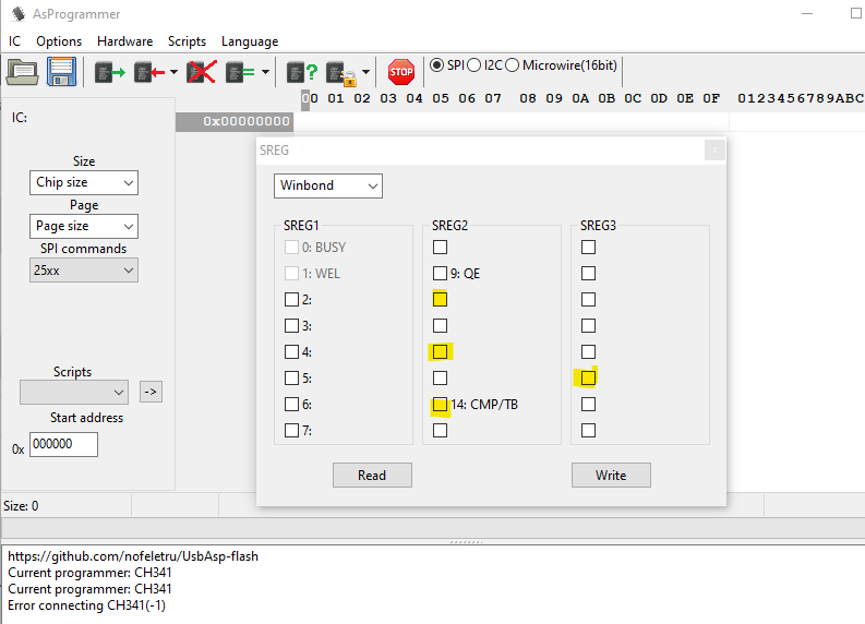 AsProgrammer window with SREG settings for a Winbond chip displayed