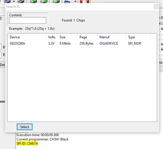 Screenshot of software showing detected GD25Q80x flash chip with SPI ID: C84014
