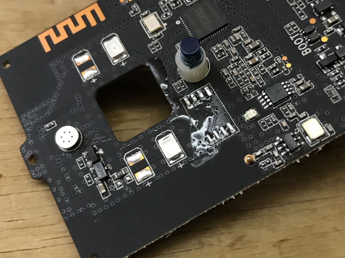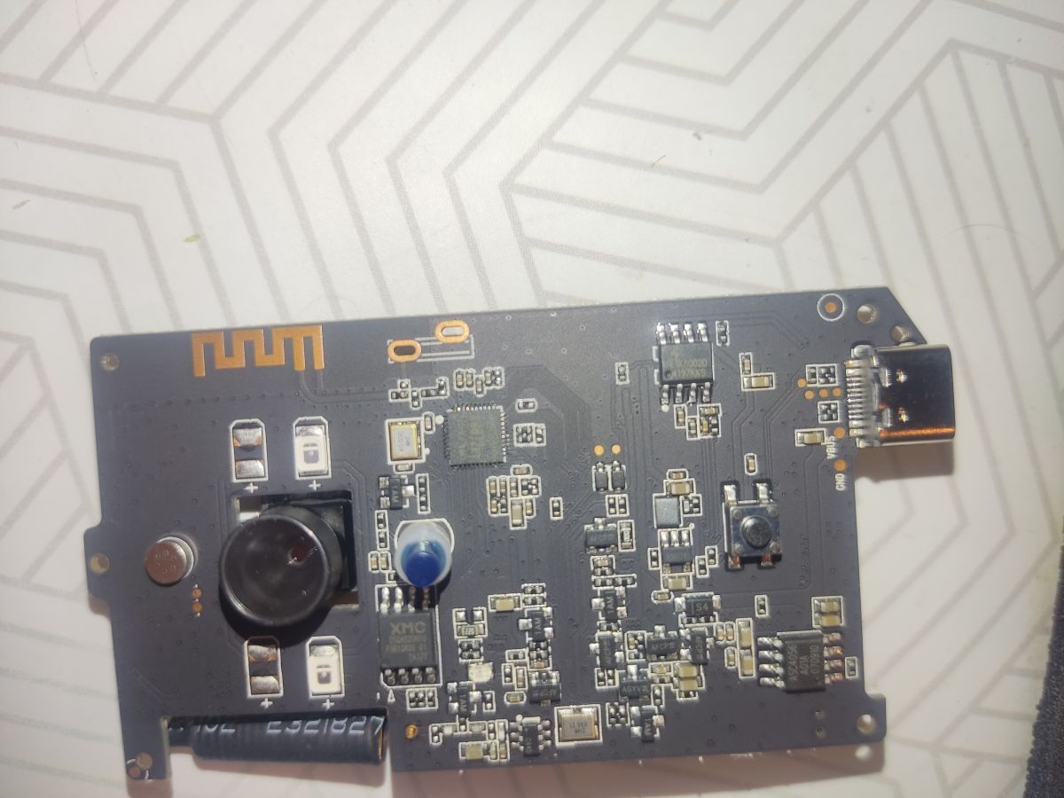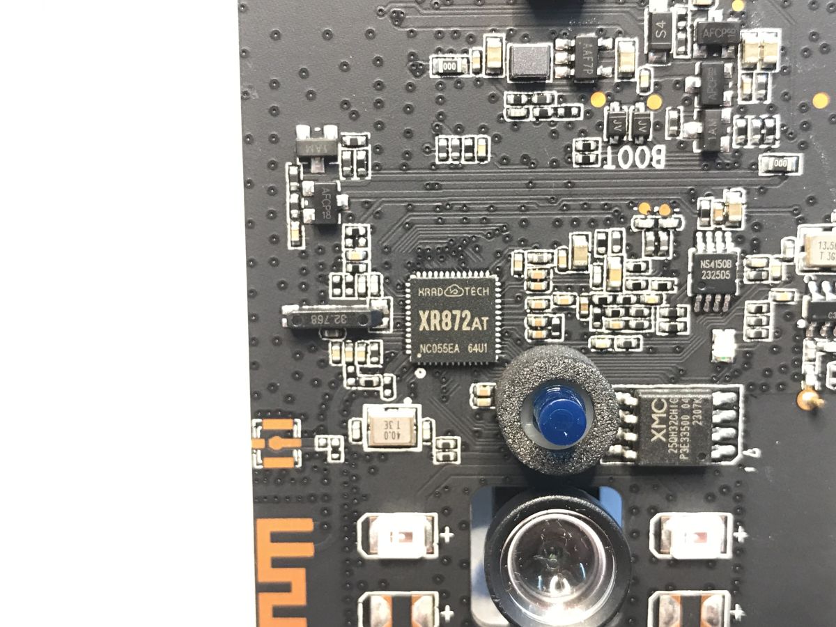 Close-up of PCB with XR872AT chipset and XMC 25QH32CHIG SPI flash Close-up of PCB with camera lens, microphone, and XR872AT and XMC 25QH32CHIG chips