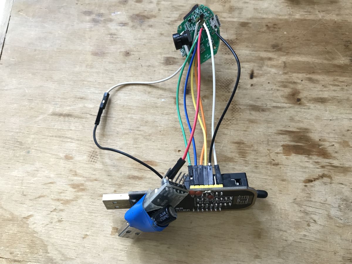 SPI programmer connected to a circuit board with colored wires on a wooden workspace Camera module on PCB with lens and ribbon cable connector visible Close-up of PCB with flash chip C74014 and flat ribbon connector Close-up of a PCB with XF16 chip, microSD slot, and micro USB port