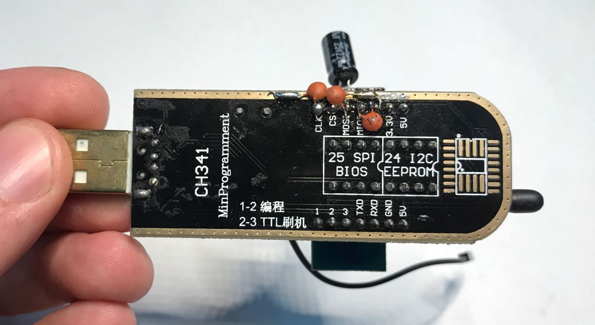 ESP8266 module connected to USB programmer with capacitor Electronic module with USB connector and attached SOP16 adapter CH341 programmer with USB plug and labeled SPI/I2C memory pins