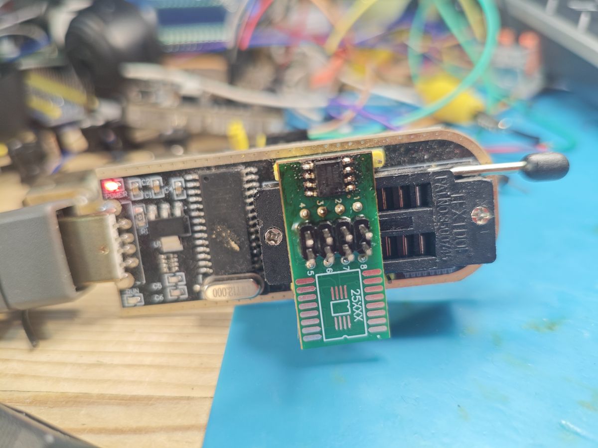 USB programmer with SOIC8 adapter for 25XXX EEPROM on a workbench.