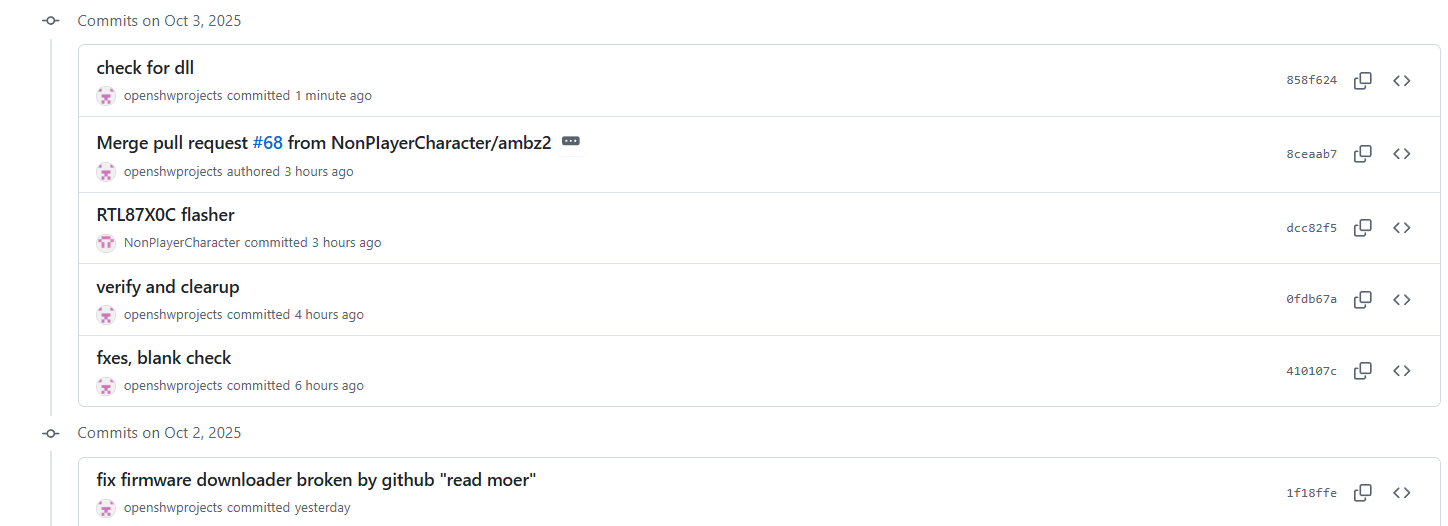 Commit list from October 2–3, 2025 in a GitHub open-source repository