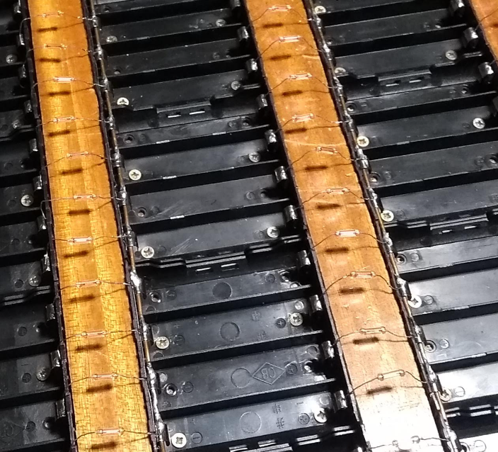 Connecting the baskets using 2.5mm square copper wire soldered to the basket terminals. And between the "backs" of the terminals and the terminals, sections of 0.1mm wide 5mm weld metal plates are inserted/inserted, in order to better treat the 4 terminals in one basket in case one of them has a worse solder with this 2.5mm square rail wire.