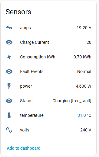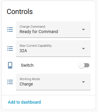 Note the quirks from the MCU, this is charging at 20A with max capability set to 32A. When set to 32A, the 16a field is not used (but does update between 1-16 if you change the 32A field). Also, the 'Charge Command' always goes back to 'Ready for Command' state after accepting a command. And the 'Switch' seems to not make any difference.