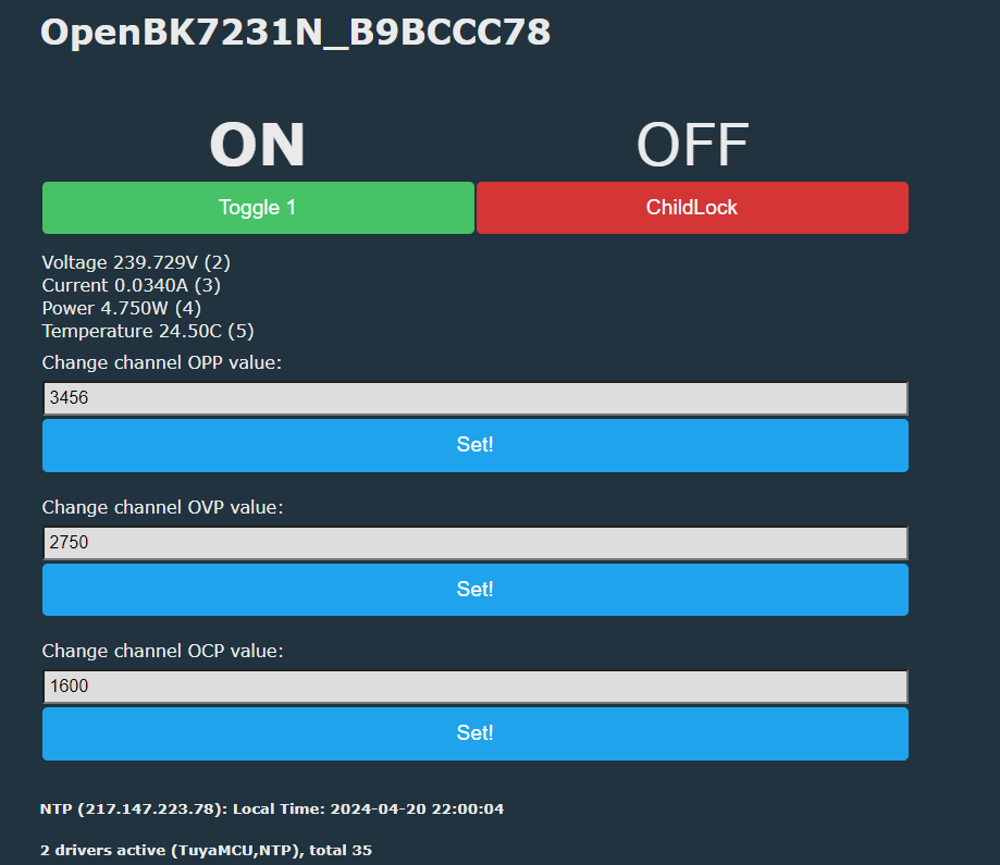 However, we are still missing the current time displayed on the device screen. For this, simply enable NTP on OpenBeken, the rest will take place automatically.