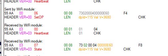 In accordance with the topic on TuyaMCU I have intercepted communication on the RX/TX lines: