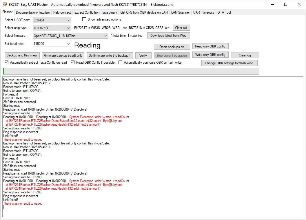 Screenshot of BK7231 Easy UART Flasher showing a flash read error
