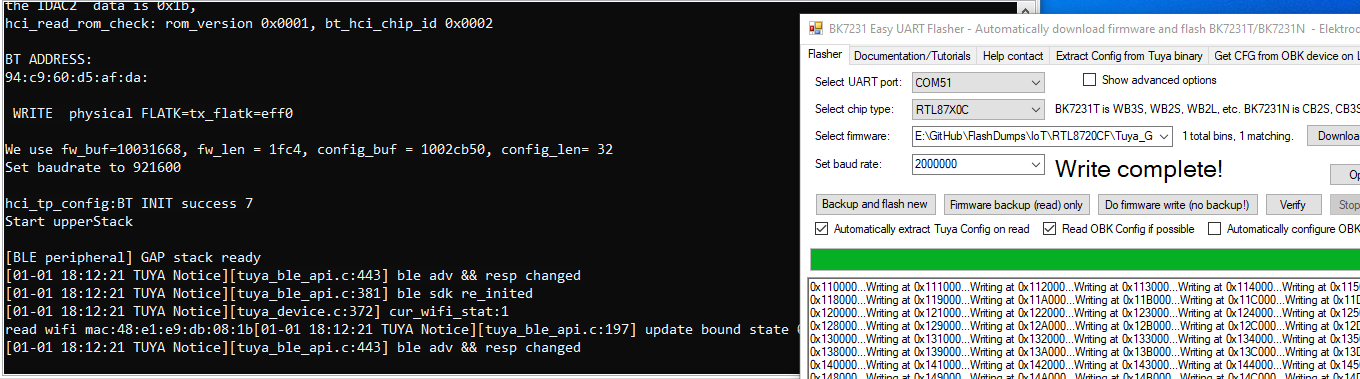 Bluetooth log console and BK7231 Easy UART Flasher with Write complete! message
