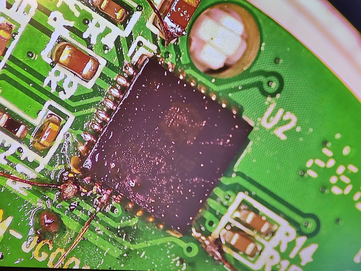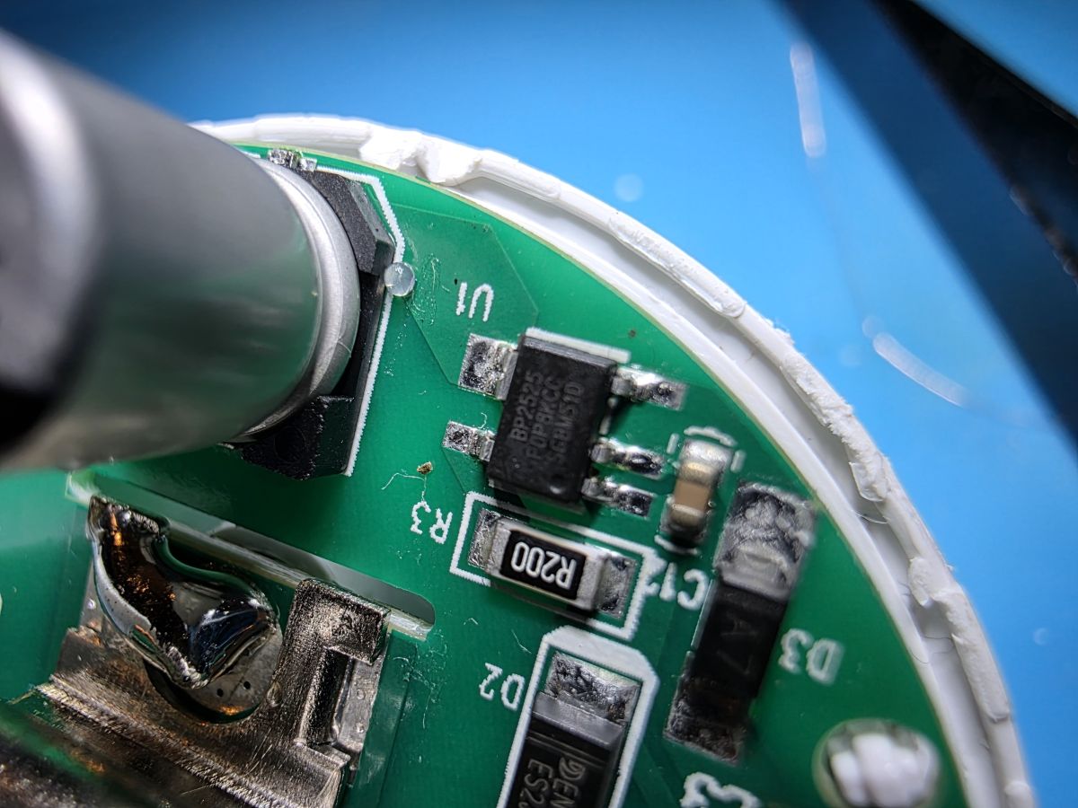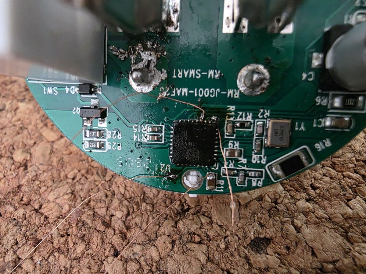 Unfortunately the pads to capture UART boot log (B9), get into flash mode (A9 grounded) and then flash/dump (A2, A3) are inaccessible until the main PCB is de-soldered from the power pins. For me this was quite destructive, melting the plastic surrounding the pins. It had to get too hot before the solder would melt. I did mix some 63/37 pb solder in first but I guess not enough.