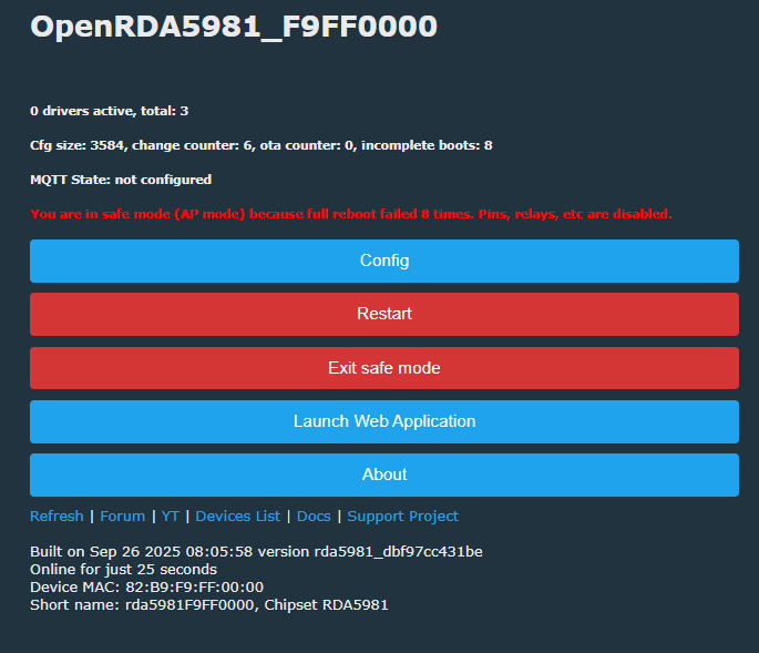 Info:MAIN:Time 25, idle 0/s, free 73063, MQTT 0(0), bWifi 0, secondsWithNoPing -1, socks 2/8