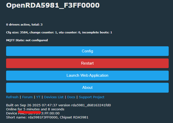 Info:MAIN:Time 1, idle 0/s, free 73175, MQTT 0(0), bWifi 0, secondsWithNoPing -1, socks 2/8
