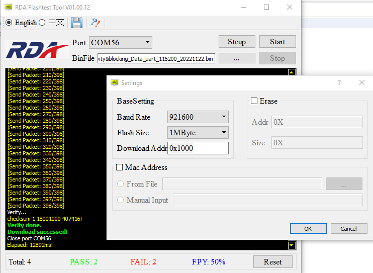 without modification RDA Dump tool loads with these addresses set by Hi-Flying. These addresses result in a 2044kb file dump, which clearly shows HLK-M50 flash content repeated.