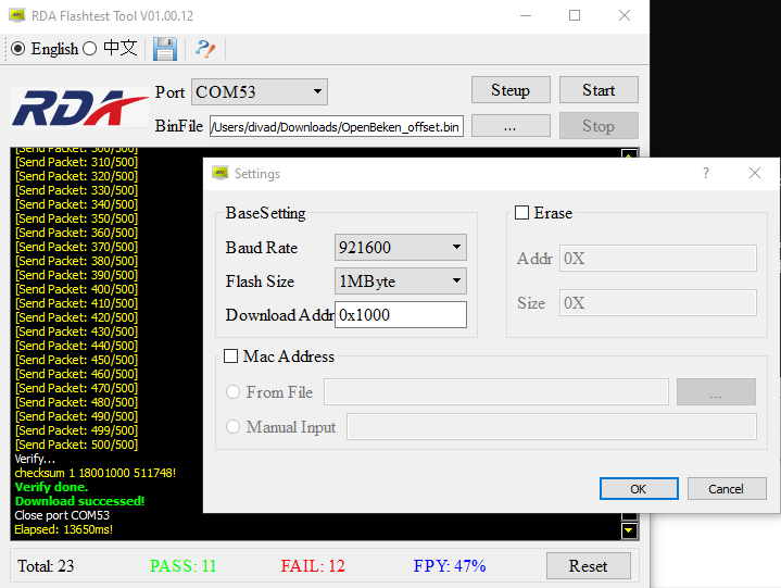 not sure 100% I understand this bit. I've flashed both Openbeken.bin and Openbeken_offset.bin to 0x1000 and 0x18001000 in RDA Flashtest Tool but the above is the only signs of anything