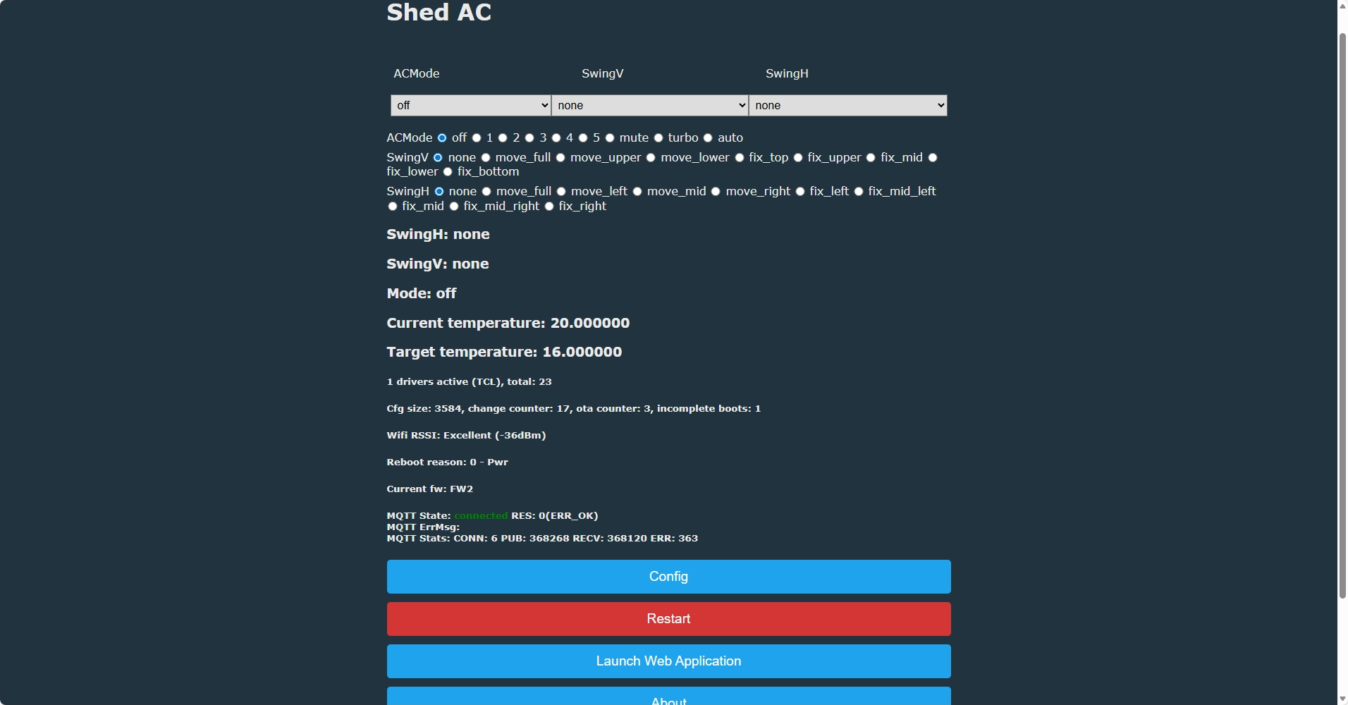 Warn:EnergyMeter:Initial size: 61Warn:EnergyMeter:BB 01 00 04 37 04 00 14 85 00 80 00 00 00 00 00 00 69 03 88 00 00 00 00 00 00 00 00 00 00 69 FF 42 00 00 1E 1D 2C 00 00 C0 00 00 00 00 79 00 00 00 44 40 05 05 00 00 1A 00 00 00 00 22 Warn:EnergyMeter:Ok we got reply with mode 1, fan 0, turbo 0, mute 0Warn:EnergyMeter:fan 00Warn:EnergyMeter:mode 04Info:MAIN:Time 83406, idle 0/s, free 51784, MQTT 1(327), bWifi 1, secondsWithNoPing -1, socks 2/21 Info:MQTT:MQTT client in mqtt_incoming_publish_cb topic bedroom_aircond/CurrentTemperature/getInfo:MQTT:MQTT client in mqtt_incoming_publish_cb topic bedroom_aircond/TargetTemperature/getInfo:MQTT:MQTT client in mqtt_incoming_publish_cb topic bedroom_aircond/ACMode/getInfo:MQTT:MQTT client in mqtt_incoming_publish_cb topic bedroom_aircond/FANMode/getInfo:MQTT:MQTT client in mqtt_incoming_publish_cb topic bedroom_aircond/Buzzer/getInfo:MQTT:MQTT client in mqtt_incoming_publish_cb topic bedroom_aircond/Display/getInfo:MQTT:MQTT client in mqtt_incoming_publish_cb topic bedroom_aircond/SwingH/getInfo:MQTT:MQTT client in mqtt_incoming_publish_cb topic bedroom_aircond/SwingV/getInfo:MQTTublishing val 21 to bedroom_aircond/CurrentTemperature/get retain=0Info:MQTTublishing val 21 to bedroom_aircond/TargetTemperature/get retain=0Info:MQTTublishing val heat to bedroom_aircond/ACMode/get retain=0Info:MQTTublishing val auto to bedroom_aircond/FANMode/get retain=0Info:MQTTublishing val 0 to bedroom_aircond/Buzzer/get retain=0Info:MQTTublishing val 0 to bedroom_aircond/Display/get retain=0Info:MQTTublishing val fix_right to bedroom_aircond/SwingH/get retain=0Info:MQTTublishing val fix_bottom to bedroom_aircond/SwingV/get retain=0Warn:EnergyMeter:Initial size: 61Warn:EnergyMeter:BB 01 00 04 37 04 00 14 85 00 80 00 00 00 00 00 00 69 03 88 00 00 00 00 00 00 00 00 00 00 69 FF 42 00 00 1E 1D 2C 00 00 C0 00 00 00 00 79 00 00 00 44 40 05 05 00 00 1A 00 00 00 00 22 Warn:EnergyMeter:Ok we got reply with mode 1, fan 0, turbo 0, mute 0Warn:EnergyMeter:fan 00Warn:EnergyMeter:mode 04Info:MAIN:Time 83407, idle 0/s, free 51784, MQTT 1(327), bWifi 1, secondsWithNoPing -1, socks 2/21