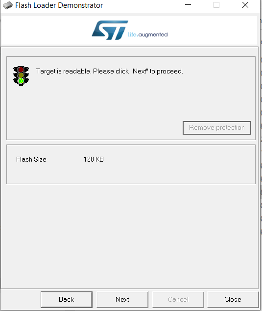 Flash Loader Demonstrator window showing readable target and flash size of 128 KB.