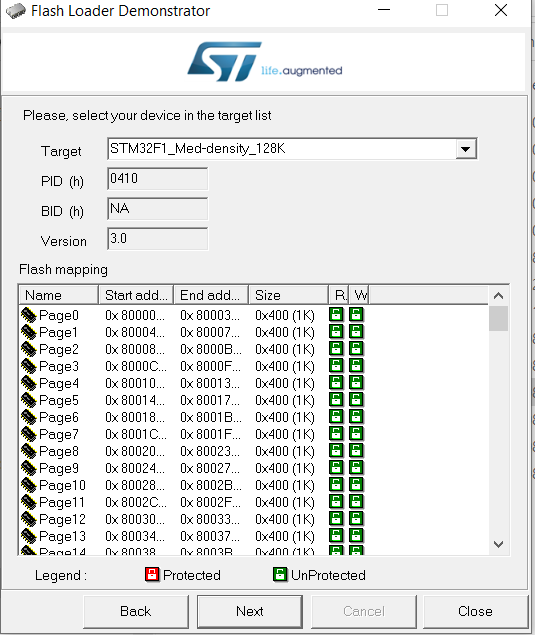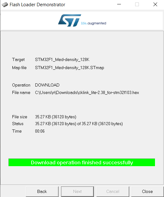 Screenshot of Flash Loader Demonstrator after successful STM32F1 firmware download