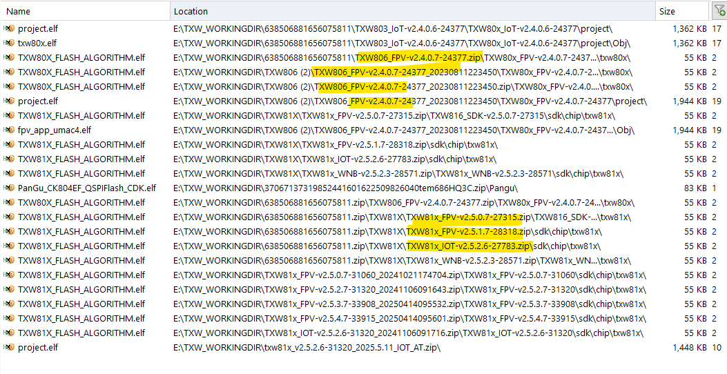 List of ELF files and SDK paths for TXW806 and TXW81X in Windows File Explorer