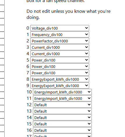 Community code exposes voltage, frequency, current A/B, power A/B, import/export energy, PF, plus Home Assistant discovery. [Elektroda, maxters007, post #21694008]