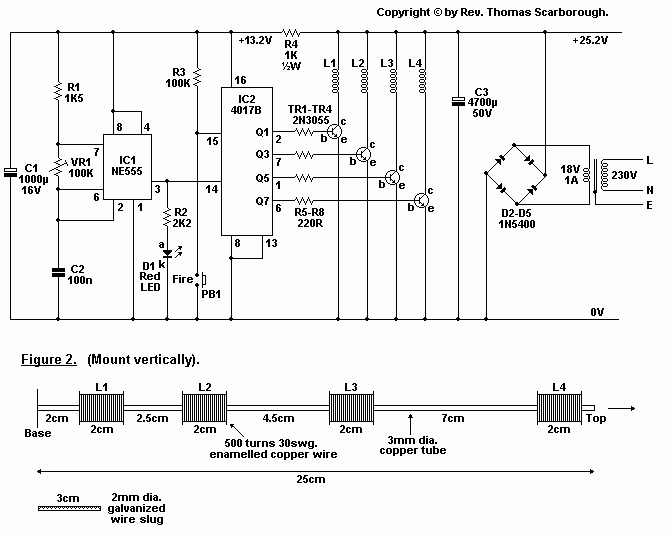 As for the exact size of wire, different sizes will work but you will get different inductances and therefore current rise times, voltage kickbacks, and of course magnetic field strength to propell the projectile. It will take some experimentation to find the right timing for each coil.