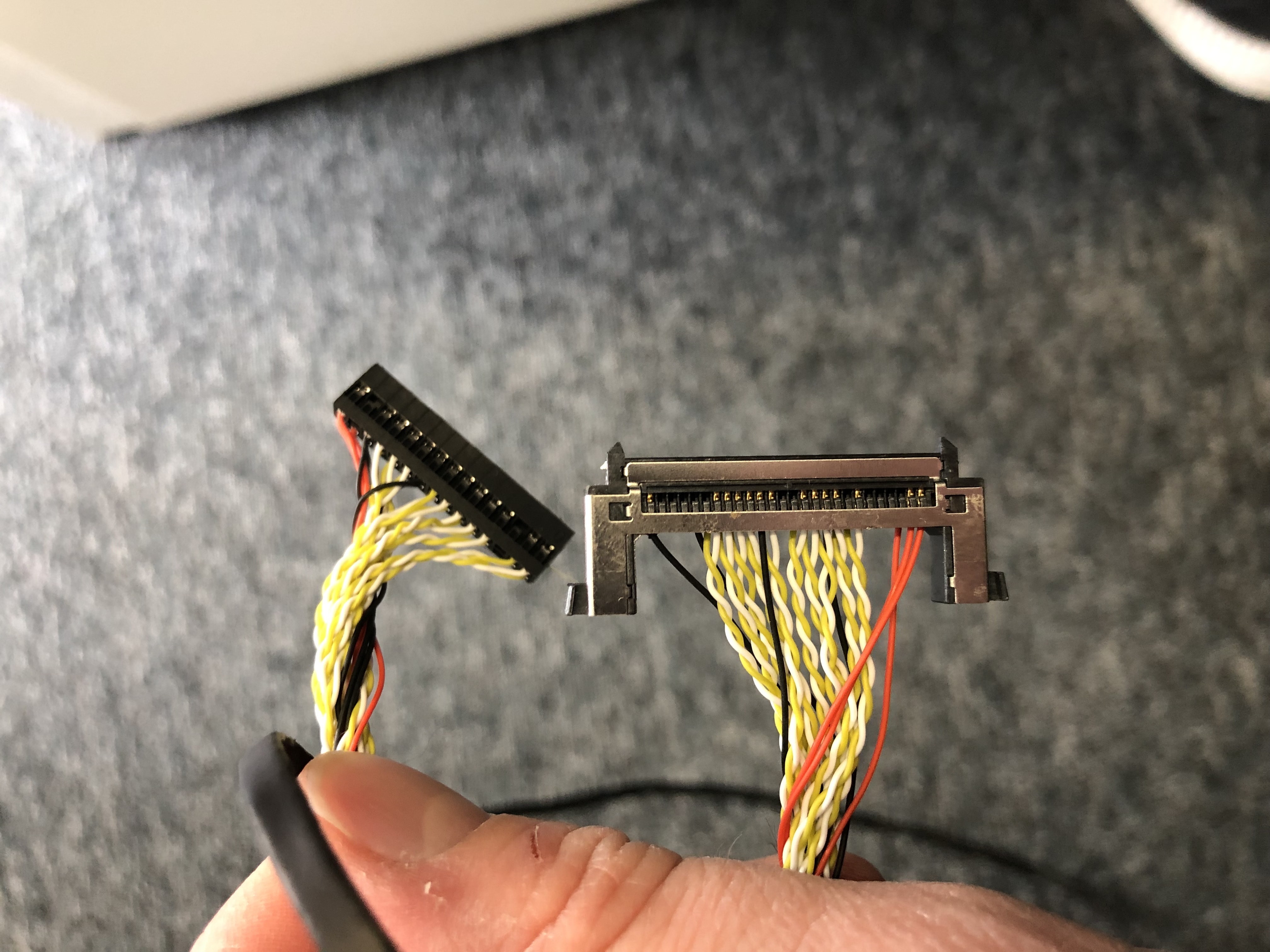 The board has two ribbons coming in and then the cable below coming out. Can anyone help identify this port/cable as I would like to convert to an HDMI port.
