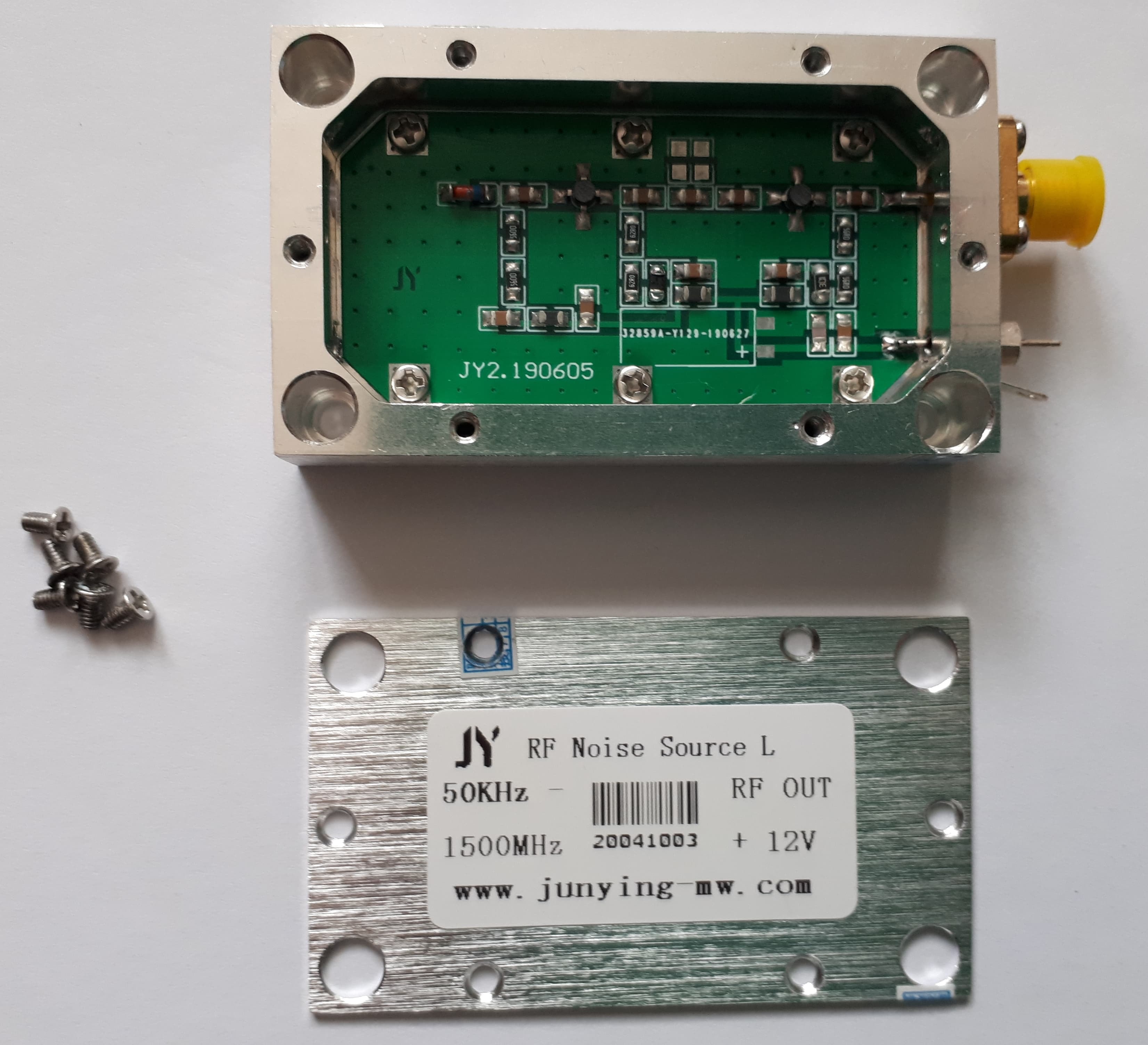I agree that we can't read the missing markings on the amplifiers. However, inspecting the connections to the amplifiers shows that various standard amplifier parts could work. In particular, the Mini-Circuits MAR-6SM+ amplifier would work on this board if we increased the values of some resistors. The datasheet states that the MAR-6SM+ is "Exact footprint substitute for Avago's MSA-0686", showing that we are dealing with multiple-sourced standard parts. The MAR-6SM+ uses Mini-circuits WW107 package, which is the same size and shape as the amplifiers on the board, and the MAR-6SM+ pinout agrees with the connections on the board. The MAR-6SM+ has 2000 MHz bandwidth, and the circuit label specifies 1500 MHz, so we are in the ballpark. From the label, the DC supply is +12V. From the MAR-6SM+ datasheet, the series resistance from +12V to the MAR-6SM+ output should be 536 ohms. From the photo of the PCB we see resistors from +12V to amplifier output. For first amplifier, resistors sum to (62+62+??=124+??) ohms. For second amplifier, resistors sum to (300+56+56=412) ohms. Thus, the resistors would have to be changed if we wanted to replace the amplifiers with MAR-6SM+ chips. The Zener diode is the source of the noise, and the two amplifiers increase the noise to the desired output level.